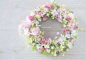 うすい桃色やしろい花々を 10種類以上もあつめ リースにしました