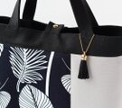 デザイナーズファブリックのブラックトロピカル葉柄に、グレーとベージュの無地帆布を組み合わせたトートバッグです。表は花柄が多め、裏は無地が多めの二面楽しめるデザインです。