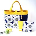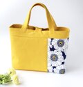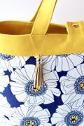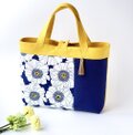 デザイナーズファブリックのデイジー柄に、紺と黄色無地帆布を組み合わせたトートバッグです。表は花柄が多め、裏は無地が多めの二面楽しめるデザインです。
