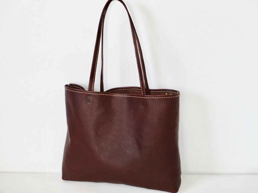 新しく仲間入りしたイタリア革のタバコ(こげ茶)で、シンプルなトートを作りました。