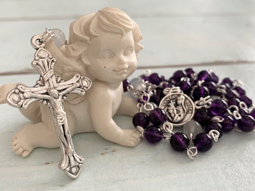 アメジストとホワイトムーンストーンを合わせたロザリオです。