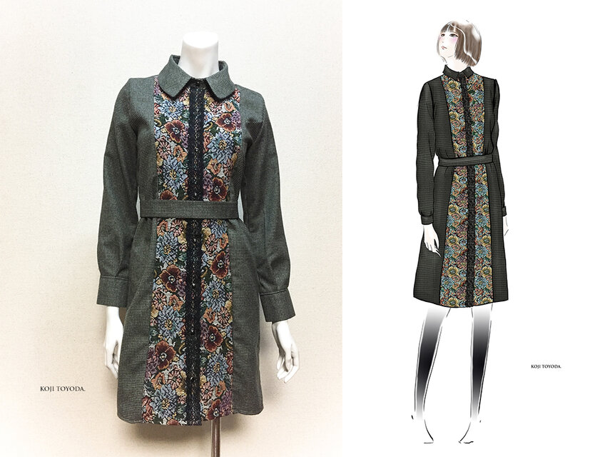 【1点もの・デザイン画付き】ゴブラン織り切り替えベルト付きシャツ型コートワンピース(KOJI TOYODA)