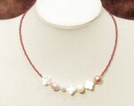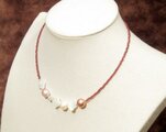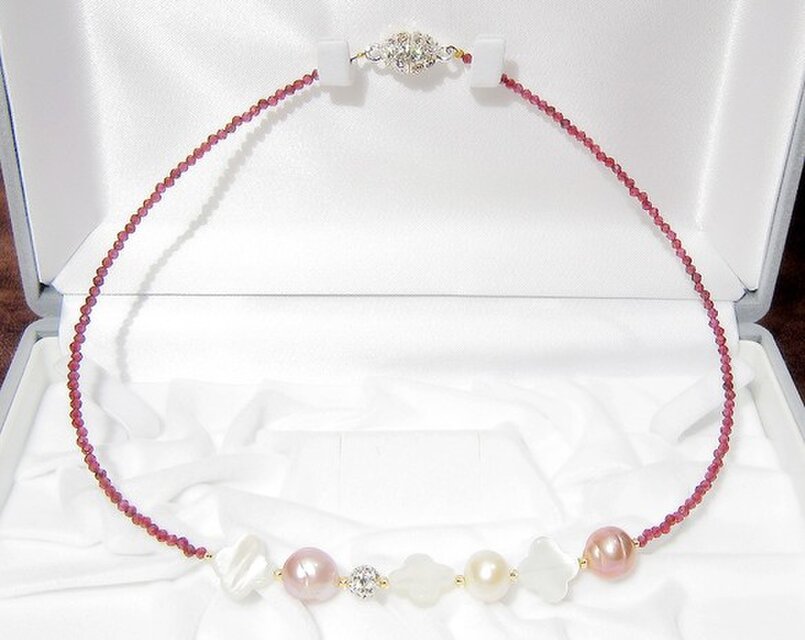 照りのとても強い、高品質の本真珠(淡水)と、南洋真珠のネックレスなどの高級宝飾品用に使われる輝きが特に強いボール、白蝶貝の貝パーツ(マザーオブパール)、写真では伝わりませんがきらきらした輝きが綺麗なガーネットを使ったネックレスです。