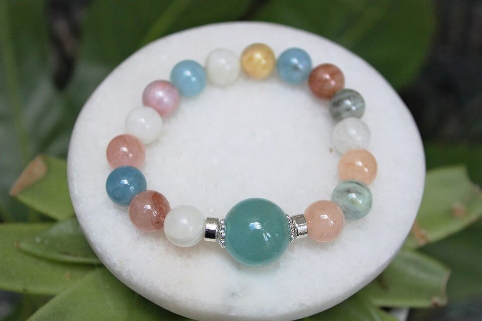 中心に15ミリのエメラルド、10ミリのモルガナイト、エメラルド、アクアマリン、ムーンストーンをアトランダムに配置しました。