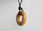 ペンダントトップの直径は約41mm、厚み11mmです。ネックレス部(こげ茶丸革紐2mm)一周の最大長さは720mmほど。小さな木球の両側にある2つの結び目の間隔を拡げたり狭めたりすることで、紐の長さの微調整が可能です。また、紐端部を切っての調整もしていただけます。
