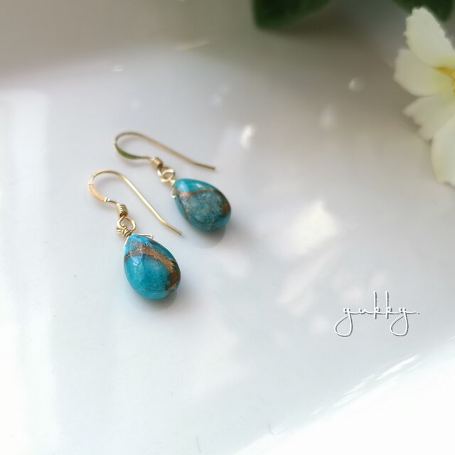 春/新作/ブルー/コッパー/カッパー/ターコイズ/ペアシェイプ/夏/初夏/しずく/ギフト/プレゼント/ゴールド/イヤリング/14kgf/ピアス/ノンホールピアス
