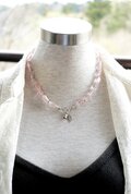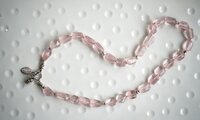 長さ10~16mm程度の様々な大きさのローズクオーツをシルク糸で結びながらつなげていったネックレスです。