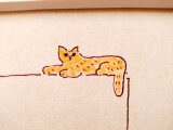 ペンと水彩絵の具を使用し、手描きで描いた茶トラ猫がいる絵です。