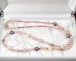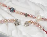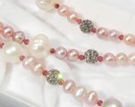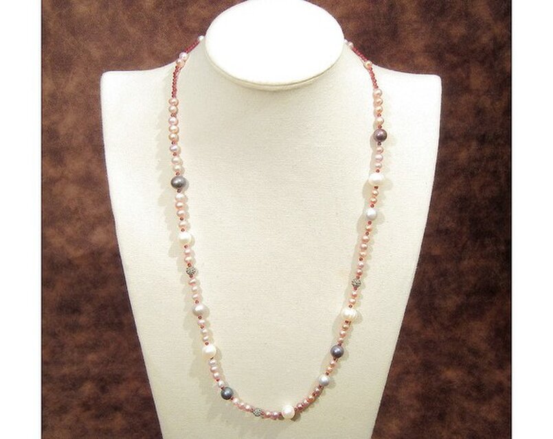 照りが綺麗な高品質の本真珠(淡水)と、南洋真珠のネックレスなどの高級宝飾品用に使われる輝きが特に強いボール、写真では伝わりませんがきらきらした輝きが綺麗なガーネットを使ったネックレスです。