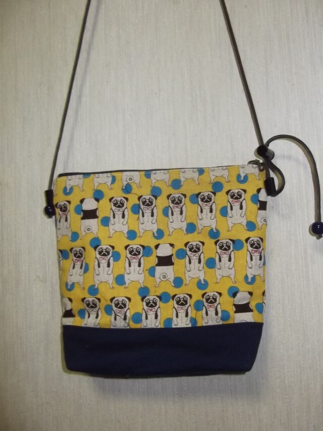 困った顔のパグ柄のコットン地のミニショルダーバッグです。