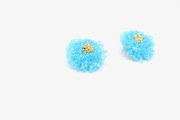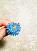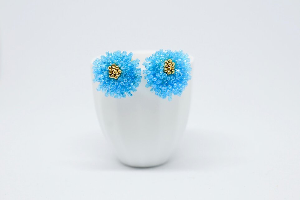明るいブルーのスリーカットビーズをぎっしり編み込み、立体的にスタンズアウトするように刺繍して作りました。