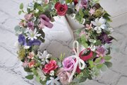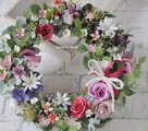 リース素材:アーティフィシャルフラワ-(造花):バラ・デージー・アストランティア・ブバルディア・アジサイ・小花・プミラ、など。その他:ピンクと白のリボン飾り(取り外しできます)。