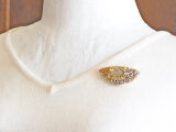 素材:シルクオーガンジー、スパンコール、ガラスビーズ、金属製ビーズ(アンティーク)、ガラスストーン(ヴィンテージ含)、刺繍糸。土台は金属製のセッティングを使用。回転式ブローチ金具となっております。