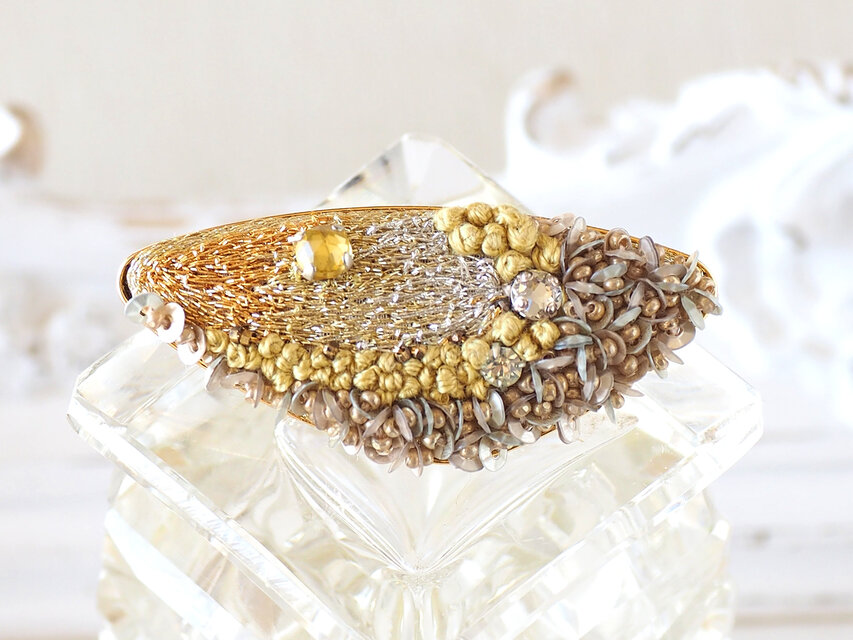 オートクチュールのドレスの一部のような手の込んだ刺繍ブローチです。上品な華やかさで、世界に一つと思うと気分が上がります。ありがとうございました。