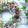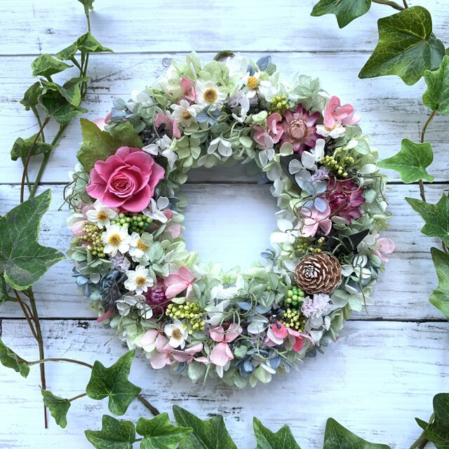 プリンセスピンクのプリザーブドフラワーのバラやピンクの帝王貝細工を、ブルーグリーン・ブルーライムなどのグレイッシュカラーのアジサイで包んだ大人可愛いリースです。