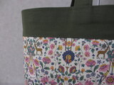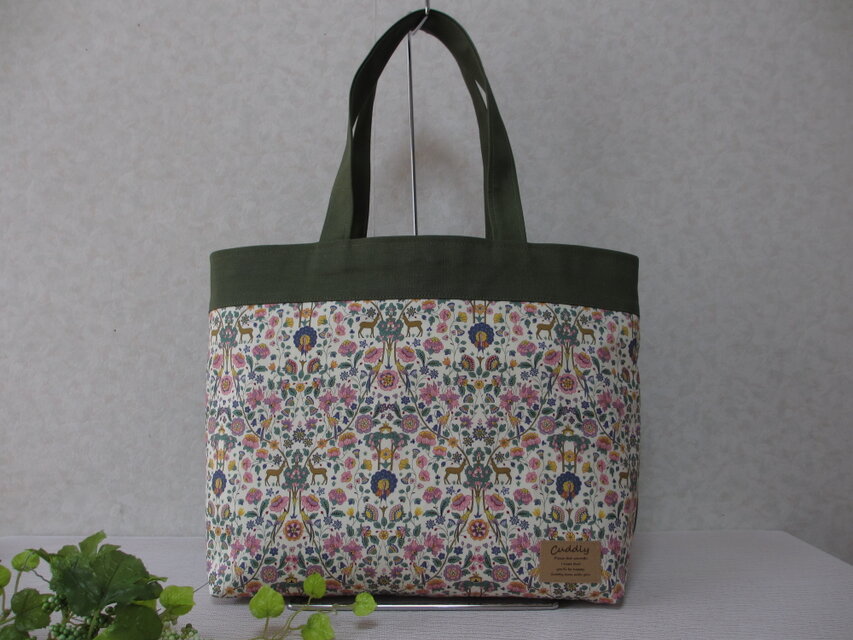 優しいピンクの色合いが和ませてくれそうなリバティとオリーブ色の無地との組み合わせで少し大きめトートを