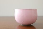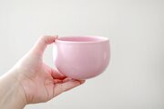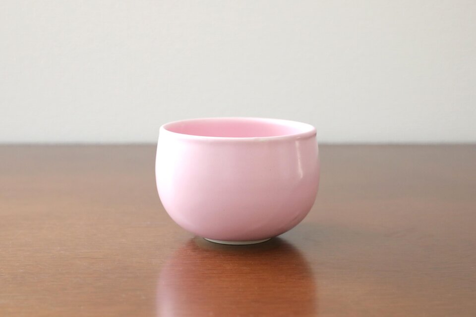 なめらかな白土をろくろで成形し、マットな桜色を発色する釉薬をかけて焼成しました。