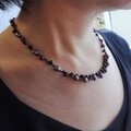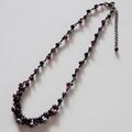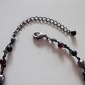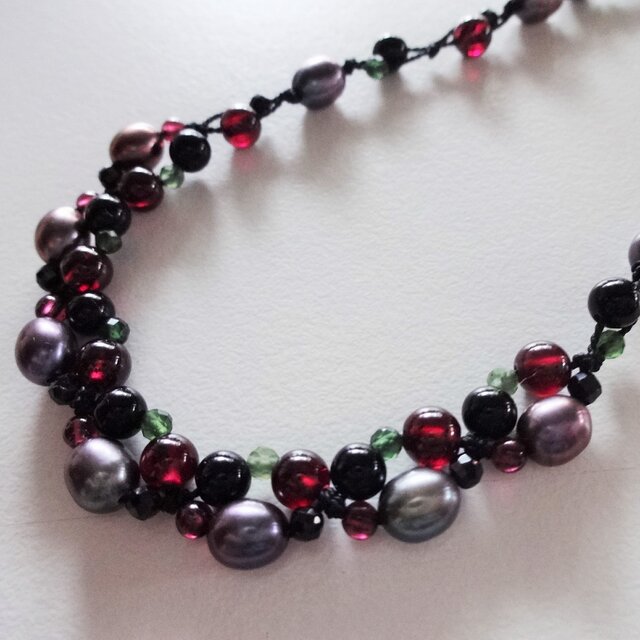 赤黒く染まった淡水パールと深い赤のガーネットをメインに、ちょっと毒々しい色合いのネックレスを編んでみました。