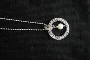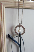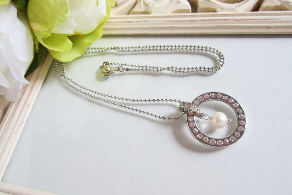 ホルダーとしてのリングはチェコ製のカットガラスでぐるりと一周取り囲まれているとてもきれいなリングです。ペンダントとしても使えるように取り外し可能なクリッカーを付けています。このクリッカーもリング同様チェコ製カットガラスが付けられていています。クリッカーには艶のある淡水パールを一粒下げました。チェーンはリング部分に合わせてキラキラ光るボールチェーンを使用しました。