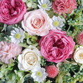 フーシャピンクのロゼットざきのプリザーブドフラワーのばらを中心にピンク〜ホワイト系のバラをボックスに詰めてみました。また、母の日のギフトにもできるようにソーラーフラワーのカーネーションを添えました。ピンクの千日紅やカモミールの小花を入れ華やかな色合いにも可愛さのあるアレンジにしました。