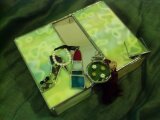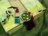 女子の必須アイテムを飾り付けたステンドグラスのジュエリーボックスです。