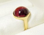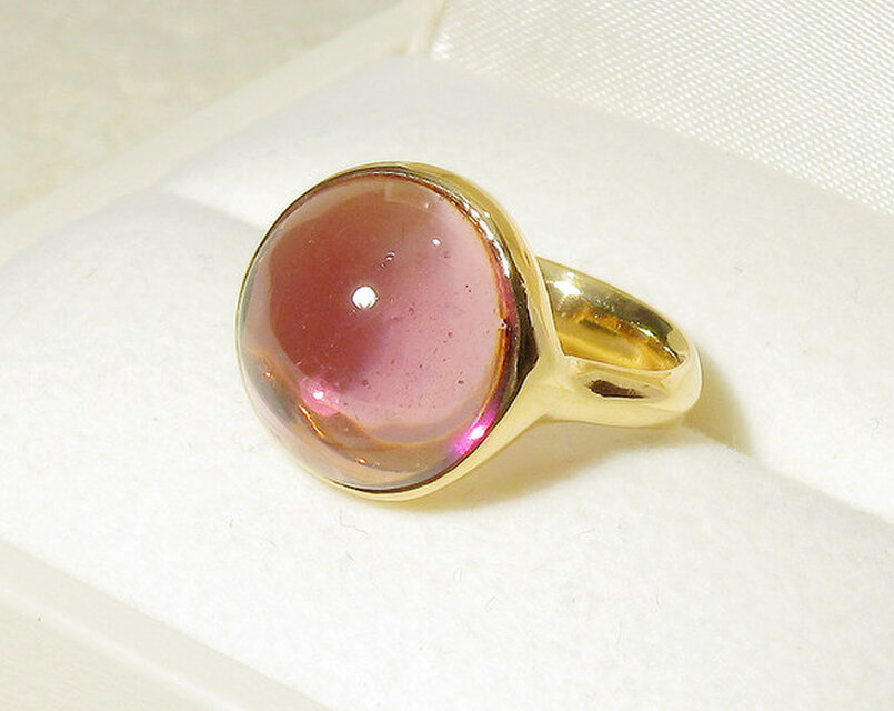 丸いカボションカットのアメシストを、ロストワックス(専用のロウで枠の原型を作り、その形通りに鋳造する製法)で作ったオリジナル枠に留めた指輪です。