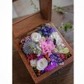 プリザーブドカーネーション、プリザーブドローズ、ドライスカビオサなどミックスアレンジですが花色は何年も残る花材です。