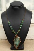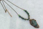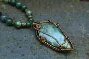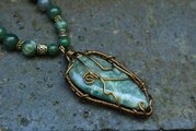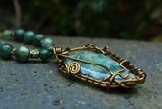 翡翠の美しいカボッションをアンティークゴールドのワイヤーで巻きました。組ませたのは、6mmのブラッドストーン、8mmのセラフィナイト、モスアゲート、6mmのアベンチュリンです。