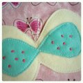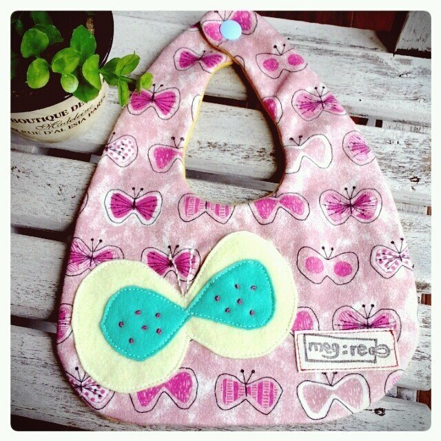 たくさんの蝶々の生地に、さらにフェルトで蝶々をつけた、蝶々いっぱいのスタイです。