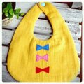 山吹色のような、濃くて少し落ち着いた感じのイエローです。 リボンもつけて可愛く♪
