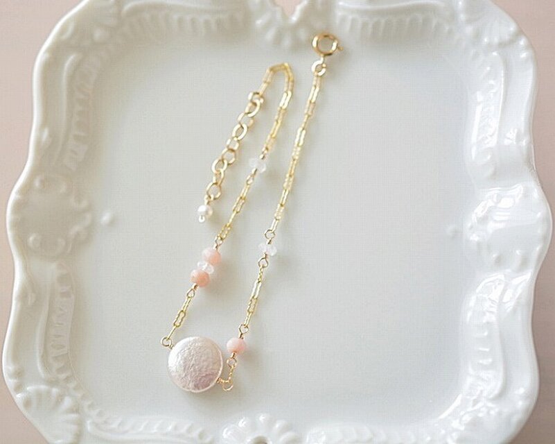 淡水パールのコインカットをメインにブレスレットを仕立てました。