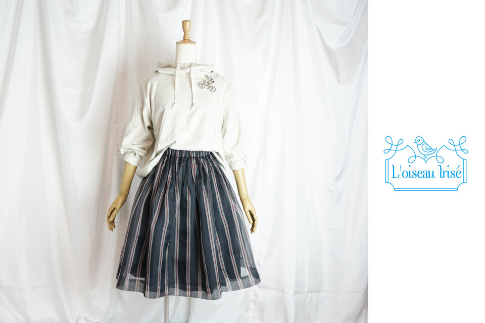 先染めで織られたストライプ柄のシルクオーガンジーで、ひざ丈のゴムギャザースカートを仕立てました。