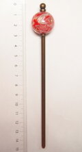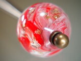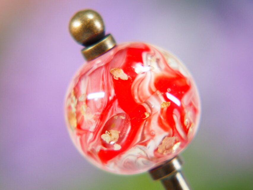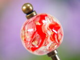 赤とグレーがかった白と透明系のガラスに金雲母を散らしたとんぼ玉を