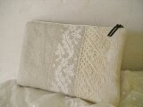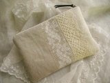 アンティークチュールレースとハンドメイドボビンレースをナチュラルリネンにのせたファスナーポーチ