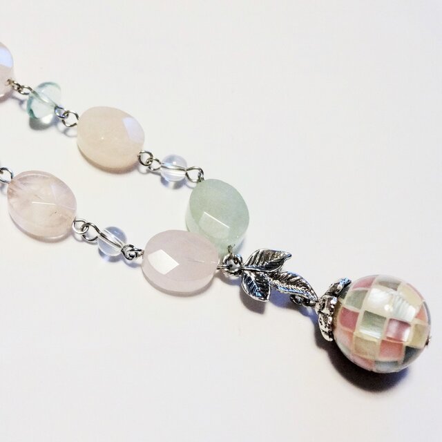 使用パーツ:モザイクシェルボール ミックスベリル 水晶 フローライト アクアマリン ローズクォーツ メタルパーツ メッキ金具(ロジウムカラー)
