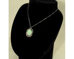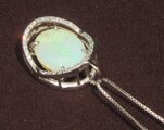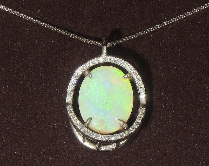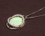 グリーンの遊色効果が綺麗な大粒のオパールと再生ダイヤモンドを留めたトップです。トップのバチカン部分の内径(チェーンを通す穴)は4mmです。
