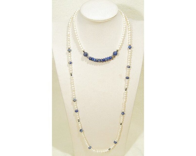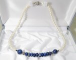 ラピスラズリとホワイト(ナチュラルカラー)の本真珠(淡水)、輝きの強いタイプのブラック・スピネル、南洋真珠のネックレスなどの高級宝飾品で使われる輝きが強いボールを使ったネックレスの2本セットです。