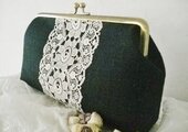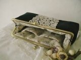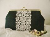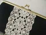 黒リネンにフランス製のアンティークギュピールレースをのせたがま口ポーチ