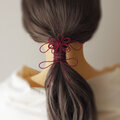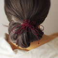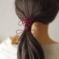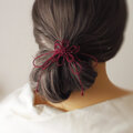 まず最初にゴム部分で髪をまとめ、垂れている紐部分をそのゴム部分の上から巻きつけて使用することにより「和」な雰囲気のまとめ髪を楽しもうと言う趣向で作りました