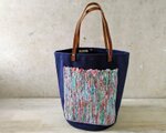 表にカラフルな裂き織の大きなポケットがあり、元気な印象をあたえます