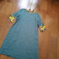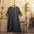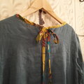 薄手のブルーグリーンのリネン生地に、マスタードカラーが効いた個性的なリバティ生地を合わせました。
