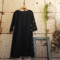 薄手の濃紺リネンとしっとり上質な手描き水玉?のような柄のリネン生地を合わせました。ベージュに濃紺の手描き風の柄が個性的でステキな生地です。