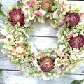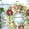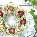 淡いピンクの帝王貝細工とクリアグリーンのアジサイが素敵な明るい雰囲気のリースです。