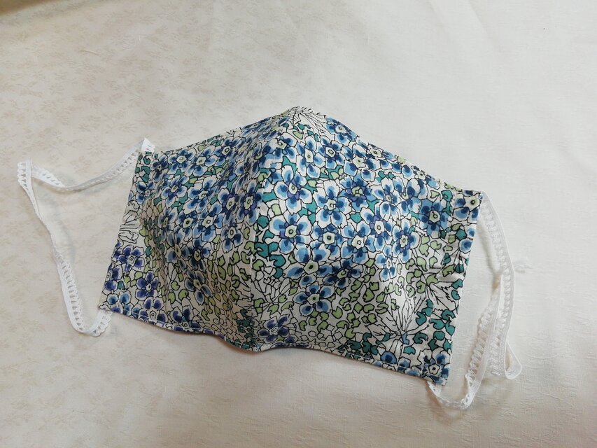 ブルーローズとシックな紫色のお花のマスク。いずれもつけ心地の質感がよく嬉しいです。感謝です。