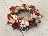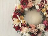ラタンリースをベースにプリザーブドフラワーのアジサイやティーツリー、ドライのタマラックコーン、イモーテル、ハンドメイドフラワーなどで制作したレッド系のリースです。