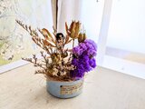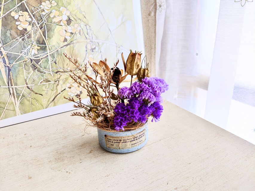 壁にかけられる!自家栽培のリューカデンドロンと紫スターチスとニゲラのアレンジメント☆自家製リメイク缶