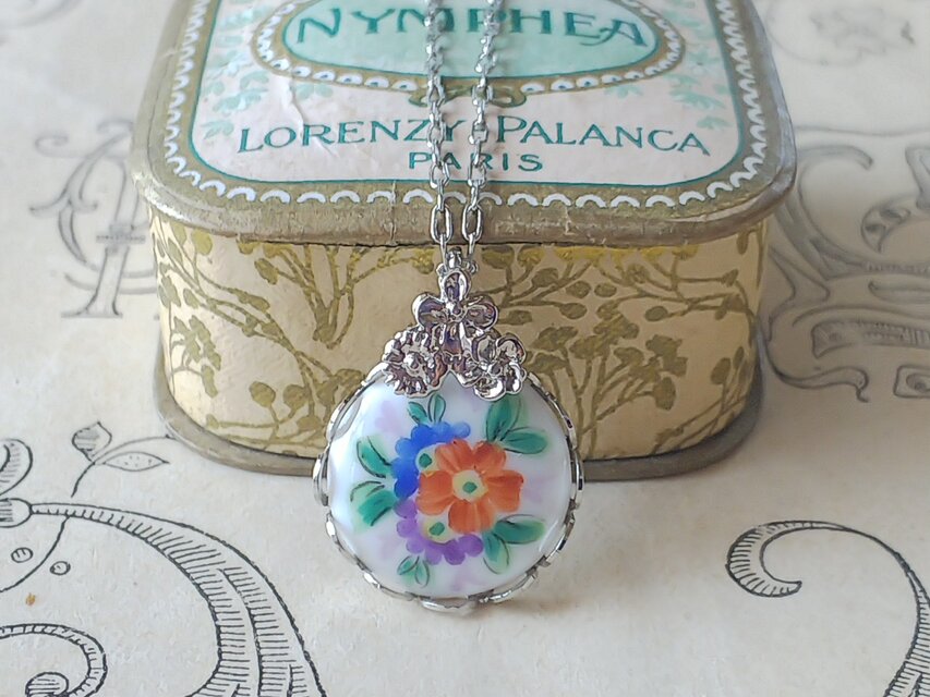 Japan、またはGermanヴィンテージ、Pocelain(陶磁器)またはGlass素材の愛らしい15㎜Round型のカボションでお作りしましたネックレスです。
