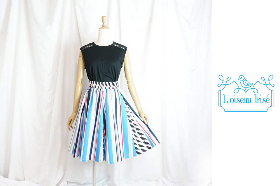 マルチストライプ柄のキャンバスとバード柄のブロードを組み合わせて、フレアーのギャザースカートを仕立てました。