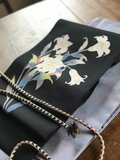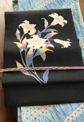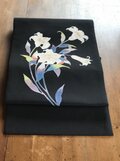黒地の塩瀬にゆりの手描き友禅の贅沢な帯です。