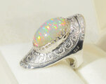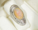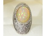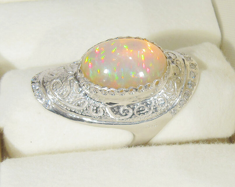 遊色効果のグリーンとレッドの強い発色が、石全体に見られる最高品質のオパールを、オリジナルの枠に留めた指輪です。どの角度から見ても、石全体に発色が見られます。